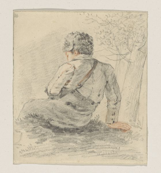 Albertus Brondgeest created this watercolor drawing, "Sitting Man with Stick, Seen from the Back," during a time of significant social change in the Netherlands. The French Revolution had spread ideals of equality and citizenship, challenging the established social hierarchy. Here, the turned back and lowered head of the man invites us to speculate on his social position and inner state. Is this an image of a rural worker momentarily at rest, or a man burdened by the weight of societal expectations? The walking stick may symbolize his journey, or perhaps his reliance on simple tools in a changing world. The limited palette evokes a sense of melancholy, mirroring the period's shift from old certainties to new, undefined social norms. Brondgeest’s choice to depict the man from behind avoids conventional portraiture, instead highlighting the human figure in the landscape, inviting viewers to consider the complexities of identity in a time of transition.