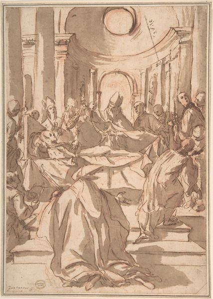 Bernardino India created this pen and brown ink drawing titled 'The Madonna and Child Enthroned with Saint John the Baptist and Saint Andrew’ sometime between 1528 and 1590. The figures emerge from the paper through a network of fine lines and layered washes. The composition is structured around a central, pyramidal arrangement of the Madonna and Child, flanked by the saints, creating a balanced yet dynamic visual field. India uses line and shadow to define form, with hatching and cross-hatching building volume and depth. Light seems to sculpt the figures, accentuating the folds of drapery and the contours of their bodies. This meticulous attention to form aligns with the Renaissance emphasis on anatomical accuracy and idealized beauty, but the energetic lines lend a certain dynamism. The drawing’s sepia tones contribute to a contemplative mood, inviting viewers to reflect on the spiritual content and artistic skill evident in this work. The cross, a potent symbol, adds layers of meaning to the scene, prompting consideration of sacrifice, redemption, and faith.