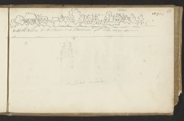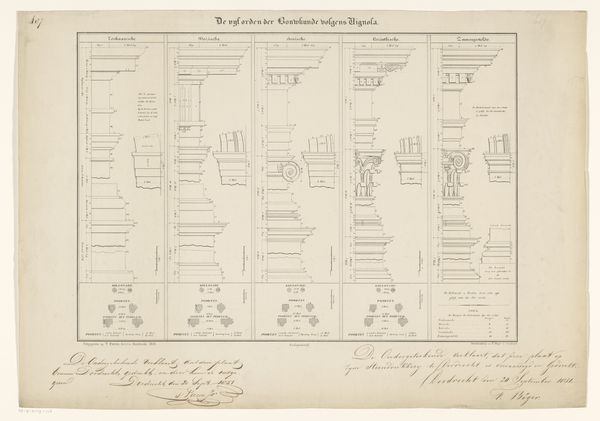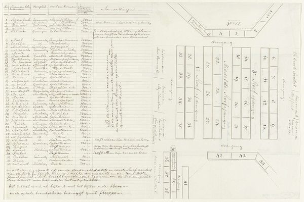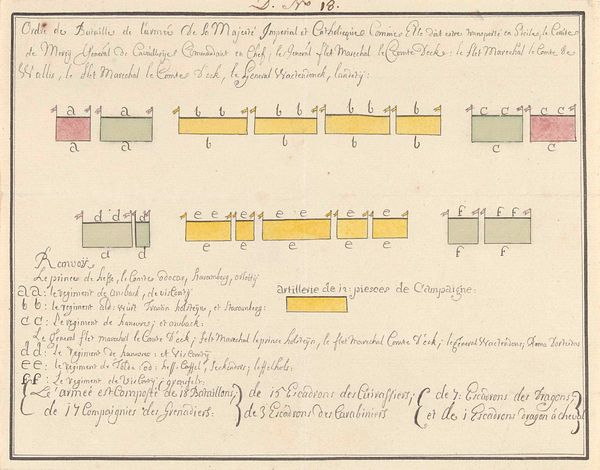 Curator: This drawing, "Slagorde van de het Geallieerde leger onder de Heer van Ouwerkerk," dates from around 1701-1715 and is attributed to Samuel Du Ry de Champdoré. It's made with ink on paper. Editor: It almost looks like a diagram of something rather than art. What do you see in this piece, focusing on its pure form? Curator: Initially, I'm drawn to its abstract quality. Consider the deployment of linear elements; notice the use of parallel lines and color blocks. These design choices structure the overall composition of the document and can act as a bridge for interpreting meaning through the structure, organization and patterns revealed within. Editor: So, the rows of lines and colors aren’t necessarily about representing soldiers. Curator: Not directly, no. They function as structural devices. The ink, applied meticulously, articulates divisions and groupings within the documented array. Look how this organization of line, form, and limited color palette gives form to the whole. The parchment, serving as a substrate, interacts with the ink to contribute visual texture, giving a deeper structural and philosophical quality that invites extended meditation on the image’s meaning. Editor: That's interesting! So it's not just about what it represents, but how those elements interact and create something new, an intrinsic aesthetic and semantic significance. Curator: Precisely. Our understanding expands as we analyze the relational characteristics between form and content. Editor: This formalist perspective really encourages us to view artworks through a new, much closer lens, paying attention to what makes something what it is.