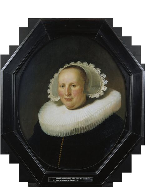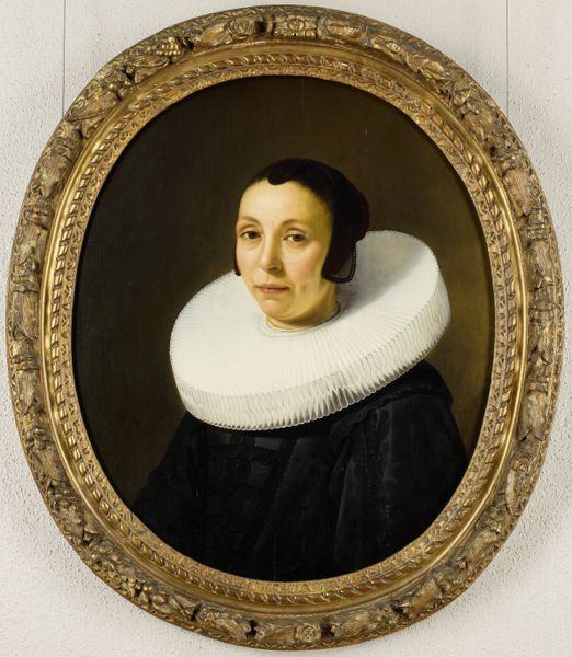 Editor: This is "Portrait of a Woman" by Nicolaes Maes, painted in 1657. It’s an oil painting currently hanging in the Metropolitan Museum of Art. She seems…sturdy. Not just her physical build, but also something about the way she carries herself. What do you see in this piece? Curator: Well, it's more than just a likeness; it’s a statement. Look at the severe black dress contrasted against the crisp white ruff. What do you associate with those colours, and what stories do you think they might be telling us? Editor: Somberness? Formality? Curator: Exactly. Now consider that ruff – it's not just an accessory, is it? It's almost a halo. Dutch Golden Age portraiture often uses these symbols to convey the sitter’s status, piety, or even profession. Does this imagery strike you as purely secular? Editor: I guess not. It's a really fine line though. Is it just elevating her social standing, or hinting at something deeper, like a quiet strength of character connected to religious belief? Curator: That ambiguity is precisely the point. The artist invites you to decipher the emotional and cultural layers within this woman’s gaze. It reflects not only her individual identity but also the values and anxieties of the Dutch Golden Age. What assumptions did you arrive at on your own, before our chat? Editor: That she was somber. Now I see strength and self-possession. This was really illuminating, thanks! Curator: Indeed! I think examining how the past resonates with our current visual language helps us better see the art.