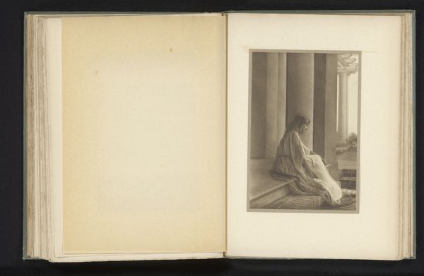 Curator: I find myself drawn to the subdued elegance in this gelatin silver print, a photograph titled "Vrouw met lauriertak bij een tempel" - "Woman with laurel branch at a temple," crafted before 1916 by Adelaide Hanscom Leeson. Editor: Immediately, I see echoes of classical statuary in the draped figure. The photographic gray evokes marble; it's striking how Leeson connects photography with the symbolic language of ancient monuments and idealized female forms. Curator: Precisely! There's a calculated ambiguity present. While stylistically adopting Classical Realism and placing the figure within an Arcadian landscape, it's equally about the cultural construct of femininity during the turn of the century, one filtered through this imagined ancient world. Consider how the laurel, an ancient symbol, signifies both triumph and moral excellence, often associated with Apollo and the arts. How does this visual language then speak to the identity of the modern woman represented here? Editor: That connection to Apollo is key. The temple isn’t simply architectural; it embodies a dedication to beauty and reason, principles celebrated in ancient societies. Placing the woman there, framed within classical ideals, she transcends a singular identity. This echoes notions of idealized womanhood prevalent in Victorian art but also raises intriguing questions about gendered roles within that era. She’s holding what looks like a bare branch; perhaps hinting at both promise and fragility, life and mortality. Curator: We cannot separate the woman in question from Leeson herself. As a notable figure in the Photo-Secession movement, she herself disrupted many social conventions as a woman artist and queer woman at that, imbuing a distinctly intersectional narrative of resistance and self-expression onto the artistic scene. Thus the symbol of the laurel carries extra weight, connoting her personal victories, in conjunction to that of the classical connotations that speak to power, victory, and even eternity. Editor: So the bare laurel might suggest resilience more than fragility—a starkness in the face of classical expectation and potential loss. It’s as though she, as a modern woman, stands at the threshold, acknowledging these enduring symbols yet also claiming autonomy over their meaning in her own life. There is indeed a quiet strength there. Curator: Absolutely, a photographic performance where identity and symbol, biography and history converge. Editor: Indeed, leaving the viewer pondering the enduring power of imagery in conveying identity.