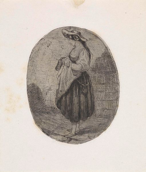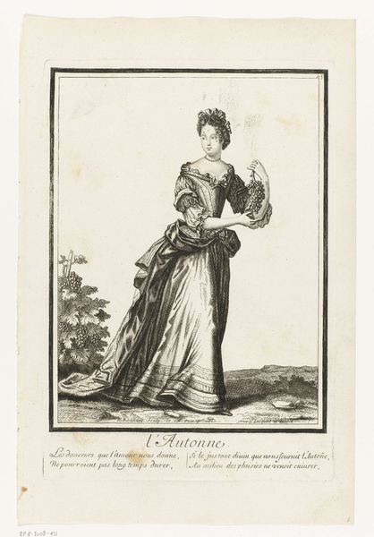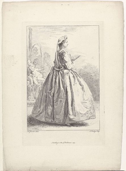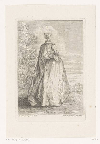 This print, "Dame gekleed volgens de mode van circa 1620," by Jean Picart, presents a woman dressed in the fashion of the time, rendered through the meticulous process of engraving. Notice how the engraver’s hand coaxes textures and forms into being; the elaborate dress is sharply defined against the subtle lines of the landscape behind. The level of detail speaks to the labor and skill involved, transforming a simple copper plate into a mirror reflecting the social status and cultural values of the 17th century. The choice of engraving isn't just about aesthetics; it's about the wider distribution of images, reflecting emerging consumer culture. Prints like these democratized access to fashion, which would otherwise have been restricted to the upper classes. Looking closely, we can see more than just a portrait; we see the story of materials, labor, and the changing world of art and commerce.