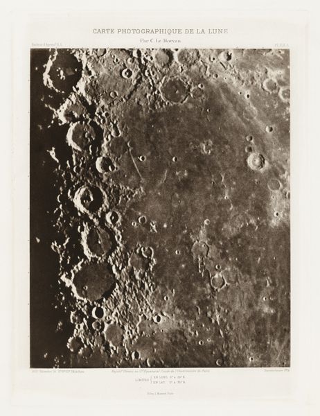 This is "Photographic Chart of the Moon, plate XX" made by Charles Le Morvan, though without a specified date, it’s likely from the late 19th or early 20th century. Looking at the image, it's fascinating to think about how it was made through a photographic process, layering light and shadow to map out the moon's surface. What strikes me is the texture of the image, the way the light plays across the craters and valleys of the moon. It feels almost like looking at a drawing made with charcoal or graphite, each mark carefully placed to build up a sense of depth and volume. Notice the crater in the upper right, with its jagged edges and dark interior. The tonal variation in this area gives it an almost sculptural quality. There's a sense of wonder and curiosity that comes through in this image, as if Le Morvan was inviting us to join him on a journey of exploration and discovery. It reminds me a bit of Vija Celmins' meticulous drawings of the night sky, or even some of the early abstract expressionists who were trying to capture the sublime in their work. Ultimately, it's a reminder that art is an ongoing conversation, with each artist building upon the ideas and techniques of those who came before.