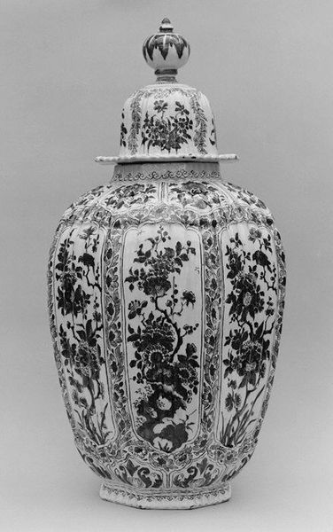 This porcelain vase, made by the Höchst Manufactory stands at just over 8 inches tall, and immediately draws the eye with its complex, yet symmetrical form. Bands of color divide the vase into distinct horizontal registers, each contributing to a sense of structured elegance. The vase uses a formal structure where geometric precision intertwines with delicate floral motifs. We see painted flowers that add a layer of naturalism to the rigidly designed shape, and these painted elements do more than simply decorate; they speak to the cultural codes of the time, reflecting an interest in natural sciences. Look closely at how the sections of the vase are articulated. The interplay between round and angular forms suggests that the vase challenges the idea of a singular, fixed meaning. The vase becomes a site where different aesthetic values and cultural meanings converge.
