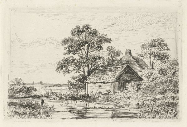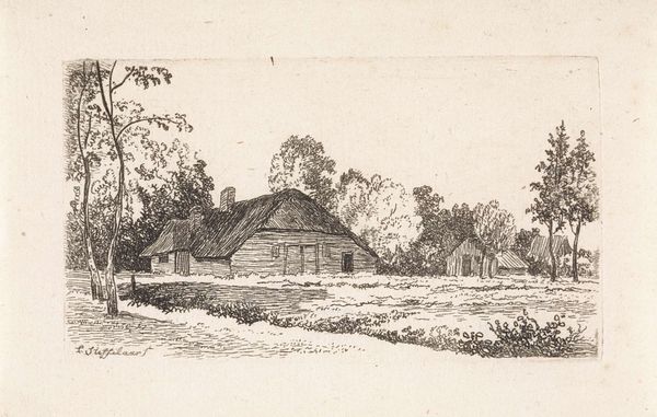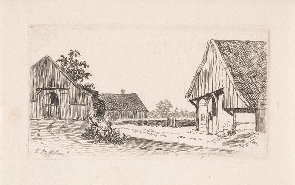 Cornelis Steffelaar etched this landscape with farmhouses and a mill, capturing a serene Dutch scene. The windmill, a prominent symbol, stands tall against the horizon. It is a nod to Dutch ingenuity and the battle against nature, harnessing the wind's power. The windmill's form is not unique, but it echoes the visual language of the cross, an ancient symbol of axis mundi, a connection between the earthly and the divine. This potent image reappears across cultures, symbolizing balance and the cyclical nature of life. Think of the Celtic cross, or even mandalas. The psychological power lies in its evocation of progress and tradition. The turning blades evoke movement, mirroring our constant striving, while its rooted structure speaks to stability, reminding us of our connection to the earth. This dichotomy touches our subconscious, reflecting a deeper human desire to reconcile change with enduring values.