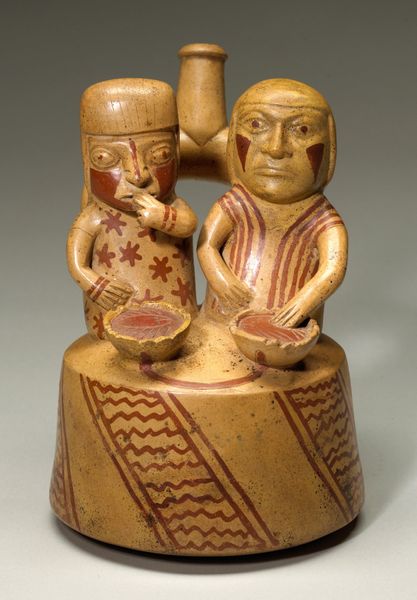 Curator: Let's spend a moment contemplating this carved wooden headrest from the Luba people, created around 1880, currently residing at the Minneapolis Institute of Art. Editor: It's quite beautiful, there is something so human and delicate in how the figures are embracing the headrest itself. It almost seems like an offering of comfort. Curator: Exactly, it exemplifies the integration of the human form with functional objects in Luba art. Consider the labour: this headrest would have been fashioned by skilled hands, carving dense wood, not merely a utilitarian object but an item of prestige. Editor: Absolutely, you can see how it becomes an emblem. I love how the figures act as support, it feels symbolic, like ancestral figures watching over one’s sleep. It’s not just something functional, but also deeply spiritual. What about the materials? Are the beads significant? Curator: Certainly. Wood as a primary material links it directly to the natural environment, underscoring a connection to the earth and its resources. The red beads—glass, perhaps obtained through trade—could denote status, incorporating elements of a global exchange into local craftsmanship. And let’s think about consumption: owning this piece meant access to trade networks, affirming a specific social standing within the Luba community. Editor: That adds such a new layer of meaning, the material culture woven into the form. This intertwining makes me appreciate even more its intimate scale. You could hold a story of trade and identity right in the palm of your hand. There's a lovely tension between form and function. Curator: Precisely. We observe not merely an object, but a nexus of production, trade, skill, and symbolic language, which makes "Headrest" a significant focal point for discussions surrounding material culture. Editor: Looking at the soft wood grain gives such a feeling of serenity. Thanks to you, my mind will rest on this amazing piece. Curator: It invites reflection. These artifacts transmit so many nuances. I leave our listeners to think further about this synthesis between the practical, aesthetic and the spiritual world.