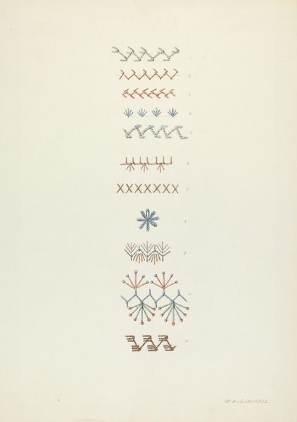 Curator: Welcome. Here we have a watercolour drawing titled "Earrings and Pendant," dating from around 1936. The artist is Charles Enjoian. Editor: It's charming! I’m struck by how delicate the rendering is, almost ephemeral, yet the composition with those drops of pink suggests such bold, unapologetic femininity. Curator: This piece certainly embodies that Art Deco sensibility, when jewelry designs saw the modernization and abstraction of previous styles, which came with profound changes in society for women. It’s interesting to consider its cultural moment, the rise of mass production influencing even artisanal crafts like jewelry design. Editor: Exactly! It's easy to imagine these pieces gracing a flapper, someone actively challenging conventional norms and embracing their agency. The color suggests so many layers, too - think of how shades of red are simultaneously read as passionate and powerful! Curator: The artist has truly harnessed the capacity for watercolours here, it looks so soft! In examining such renderings of jewelry, we have to consider their role within marketing and accessibility—they served as a promotional tool that made the prospect of luxury attainable for all. Editor: And who has access to these luxury goods then, and who decides what is beautiful? That promotional side you describe really plays into aspirational consumption. You begin to ask, who is wearing the jewelry? Curator: Right, so it could point towards an economic critique. One can definitely discuss jewelry's commodification and circulation in capitalist systems! These items perpetuate ideas of desirability within patriarchal structures. Editor: Precisely. What this brings home is that fashion and aesthetic objects are never purely about surface appearances, they are reflective of deep systemic ideologies. So how can we use it as a statement? Curator: Thinking about how art pieces have evolved, that very concept of using them to resist oppression and communicate has led to new art movements with very strong views. Editor: Yes! Viewing pieces like this gives way to those important discussions and the constant interrogation that inspires creativity and expression, wouldn't you agree? Curator: Indeed! We learn so much more when we critically analyse artworks instead of purely admire. Editor: That really makes the artwork priceless!