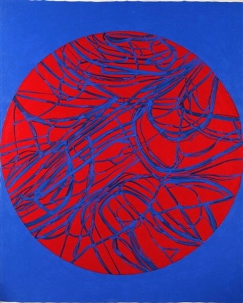 Curator: Here we have Stanley William Hayter’s cover illustration for John Montagu’s ‘Tides,’ currently held at the Tate. Editor: It's so vibrant! There's an energy to the color choices and the swirling lines—it feels almost chaotic, like the ocean itself. Curator: The image evokes the push and pull of the ocean, certainly. The contrast of red and blue could symbolize the tension between different forces, like fire and water, or perhaps opposing emotional states. Editor: Looking closer, you can really see the texture from the printmaking process. Each line has a physical presence, a density that speaks to the labor involved. Did Hayter experiment much with technique? Curator: Hayter was renowned for his innovative approach to engraving, particularly his use of color and texture to convey complex emotional and psychological states. Editor: Knowing that, it makes me consider the whole relationship between illustration and the industrial production of books and prints, and how a singular image is multiplied and distributed. Curator: Exactly, it's about conveying meaning through symbols, and Hayter was adept at tapping into the collective unconscious through his work. Editor: The way the material's manipulated really changes how we see both the image and its message. Curator: Indeed, a potent combination of artistic skill and symbolic depth.