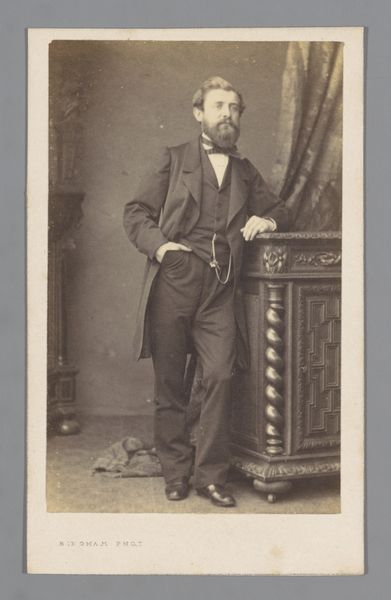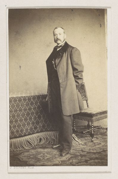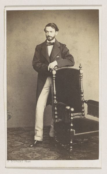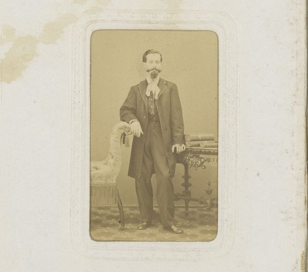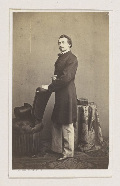 Curator: What strikes you most about this albumen print? It’s a portrait by Joseph Dupont from 1861, titled "Portret van de graveur Erin Corr, ten voeten uit," or "Portrait of the engraver Erin Corr, full-length". Editor: The tonal range, for sure. The muted browns and beiges lend it such a sense of solemnity. The figure's placement, slightly off-center, creates a visual tension. Curator: Dupont was indeed a master of capturing the character of his subjects. Photography at the time served a specific social function, allowing access to images of middle class subjects who previously would never be seen on the art world. It democratized portraiture. It is an intriguing study in pose and social expectation. Editor: I notice that his right hand delicately rests upon the chair's back, with an intriguing, light-catching signet ring. And observe how his hat becomes a focal point in the lower part of the picture, an element that also invites questions of light and shadow. It nearly has a still life feel in the rendering. Curator: You know, these details tell us so much about Corr’s status. His attire, his pose, and even the carefully selected props all reinforce his identity as a respected professional in the Belgian milieu of that time. Consider also the politics of representing labour at that moment, when photography was quickly entering and forming public memory. Editor: Right. Formally, I find that there's such economy in the use of light and shadow to sculpt Corr's face. Curator: Absolutely. The way photography documented the world changed forever the function and possibilities of visual culture, and we have to appreciate the historical contexts. Corr's contribution as an engraver, for instance, should also be studied under that light, as the development of photographic methods largely overtook the space for etching methods in many areas. Editor: Analyzing such details yields profound insight into the person, but I find formal qualities so compelling about photography from this time period. Dupont masterfully turned what could be simply a documentation of social position into a subtle statement about individual character. Curator: Yes, understanding the portrait from social context and form analysis certainly shows how powerful these early photographs could be, both as markers of identity and as works of art.