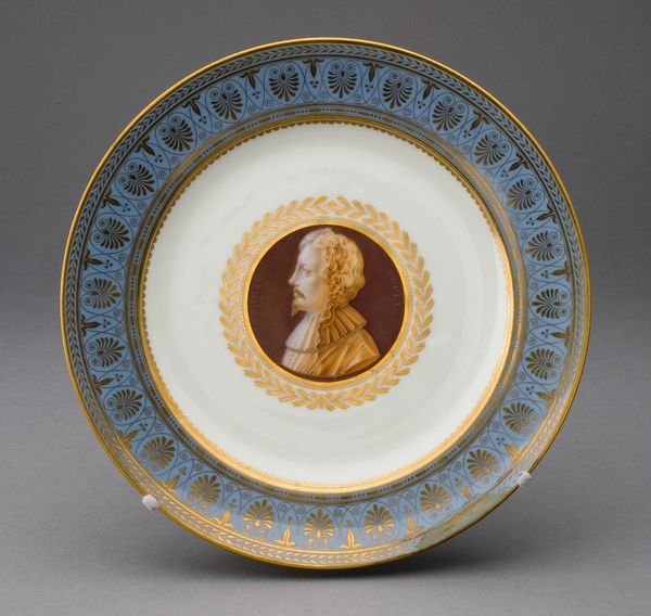 This is a portrait medallion of Frederica Sophia Wilhemina, princess of Prussia, made in porcelain by Königliche Porzellan Manufaktur. The overall impression is one of restrained elegance. The circular form, crowned with a regal motif, frames a bas-relief profile. The white porcelain against the gilt of the frame creates a study in contrasts, highlighting form through subtle shifts in light and shadow. Consider the semiotics at play: the profile, a classical reference, speaks to notions of nobility and timelessness. The use of porcelain, a prized material, elevates the subject, embedding her within a system of value and status. The absence of color encourages a focus on the purity of line and form. Through this medallion, the artist invites us to consider how power and identity are constructed and communicated through material and form. It serves not just as a likeness, but as a carefully crafted symbol within a complex cultural code.