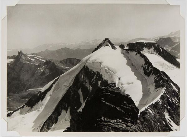 Editor: So, this is Vittorio Sella's photograph of Mt. Dent d'Herens. The scale is just immense, and the climbers in the foreground really emphasize that. What does this photograph say to you? Curator: It speaks to the fraught relationship between humans and the environment, especially in the context of colonialism and scientific exploration. Who benefits from conquering nature, and at what cost to both the environment and indigenous communities? Editor: That's a perspective I hadn't considered. It's a lot deeper than just a pretty mountain. Curator: Photography, especially landscape photography, has always been tied to power and control, hasn't it? The act of capturing and framing nature is inherently political. Editor: I see what you mean. I'll definitely look at landscape photography differently now.