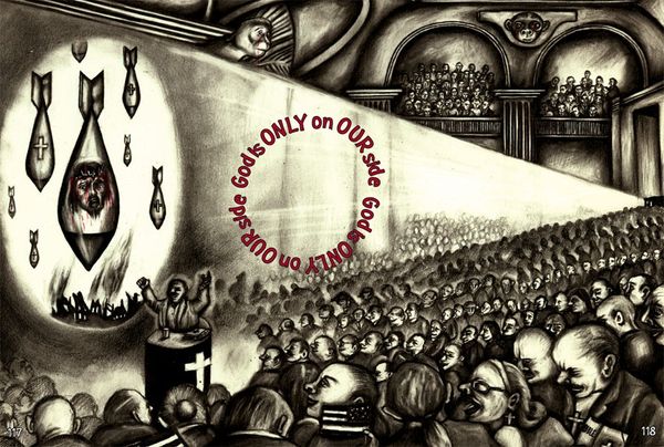 Sue Coe's "Funhouse" presents us with a stark vision rendered in monochrome. Grotesque figures populate one side, their distorted features echoing age-old fears of the demonic. The motif of the monstrous is ancient, appearing in Goya’s "Los Caprichos" and Bosch’s infernal visions. But here, Coe makes a connection with modern figures. These demons, symbols of societal ills, are juxtaposed with portraits of political figures. The monstrous, as a visual trope, reflects a deep psychological unease. In its historical journey, the monster embodies societal fears – the fear of the unknown, the fear of moral decay. Consider the gargoyles of Gothic cathedrals, meant to ward off evil. Here, the figures seem to represent the very evil they were meant to repel. Through her work, Coe touches on the cyclical nature of history and the enduring presence of primal fears, tapping into a subconscious recognition of the monstrous lurking beneath the surface of normalcy.