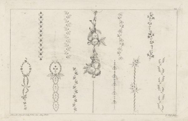 Editor: This drawing, "Kerkornamenten met blad- en bloemmotieven," or "Church Ornaments with Leaf and Flower Motifs," was created between 1866 and 1868 by Isaac Gosschalk, using pencil. They almost look like sketches of wrought ironwork... What do you see in these ornamental designs? Curator: What strikes me are these repeating, almost skeletal, floral motifs. Consider the context: 1860s Europe, a period of rapid industrialization coupled with burgeoning religious revivalism. Are these designs merely decorative, or could they be read as a commentary on the fragility of faith in a time of societal upheaval? Notice how the floral elements, traditionally symbols of life and growth, appear constrained, almost imprisoned within these rigid geometric structures. What could that signify? Editor: That's interesting. I hadn't considered the societal context, just the aesthetic quality. Do you think the fact they're on a sketchbook page makes them somehow more personal? Curator: Precisely. The intimacy of the sketchbook format invites us to consider Gosschalk's own internal dialogues. Were these designs meant to adorn actual churches, thereby imposing a specific aesthetic ideology onto the community? Or were they, perhaps, a more personal exploration of the tensions between tradition and modernity, the sacred and the secular, worked out in private? Think of the power structures inherent in dictating religious aesthetics, particularly concerning the roles of marginalized communities within the church itself. Editor: So, you're suggesting they might be more subversive than they appear at first glance. Curator: Exactly! Art rarely exists in a vacuum. Even seemingly innocuous floral sketches can become powerful statements when viewed through the lens of historical and social awareness. This perspective reframes how we understand art's role in reflecting—and potentially challenging—dominant ideologies. Editor: I'll never look at a flower the same way again! It really helps to understand the deeper layers with these art pieces. Curator: Indeed, art becomes a window into understanding ourselves and our place within a complex world, inspiring dialogues that reverberate far beyond the canvas or the page.