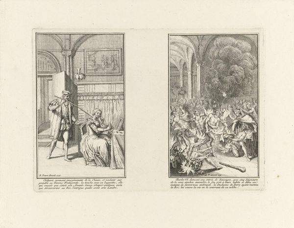 Curator: Here we have Philippe Simonneau’s "Onversneden vel met zes voorstellingen uit de geschiedenis van de abdij van Saint-Denis," created in 1706. Editor: My first impression is one of restrained elegance, the linear quality imparting a sense of archaic refinement. There is something particularly intriguing in how these six vignettes are laid out, distinct yet connected on a single sheet. Curator: Indeed. As an engraving, the artwork benefits from strong contrasts, but let us look closer at its material and process. The linear precision suggests that each scene required meticulous craftsmanship. This wasn't mass production; instead, each plate was deliberately etched. Consider what this says about its dissemination and target audience. Editor: From a formal standpoint, notice the repetitive architectural elements within each scene: towering arches, heavy drapes. The artist uses the repetition to suggest both grandeur and confinement. The light, achieved through linear variation, serves almost as an actor. The engravings on toned paper certainly contribute to that sense. But it's curious, isn't it? This elaborate portrayal of power and devotion ultimately serves to tell a manufactured truth, presenting perhaps an elevated interpretation of history. What was Simonneau actually commissioned to portray? Curator: Ah, excellent. These prints were likely produced as historical records or as a means to enshrine certain moments. The social fabric is woven into its very creation: a commission, materials sourced through specific markets, engravers’ labor, printmakers, vendors, all dependent upon economic currents and artistic tastes within the context of late baroque aesthetics. These images may reflect not literal historical truths, but also a particular desired narrative for their time. Editor: The materiality whispers a narrative beyond the surface. Paper, ink, tools -- consider the resources required and the knowledge that was both invested in and constrained this process. This history impacts our contemporary interpretation, it underscores how historical accounts, especially when mediated through art, often emerge with a clear bias. Curator: Yes. These scenes echo the opulence and the carefully orchestrated presentation, while each carefully inscribed line bears the legacy of labor and commerce. Editor: In essence, both form and making speak volumes about the power structures at play.