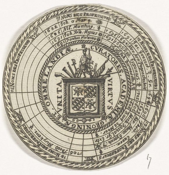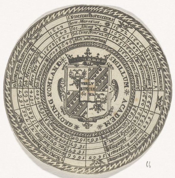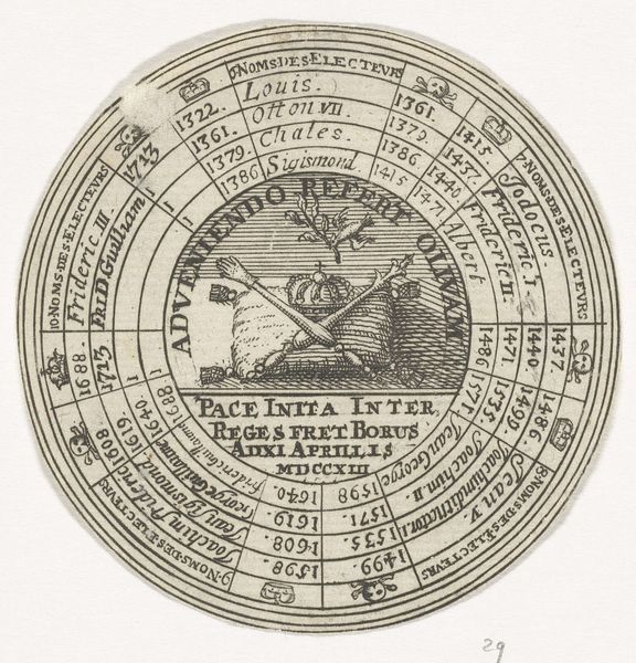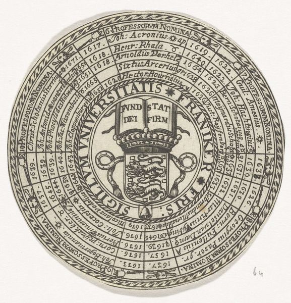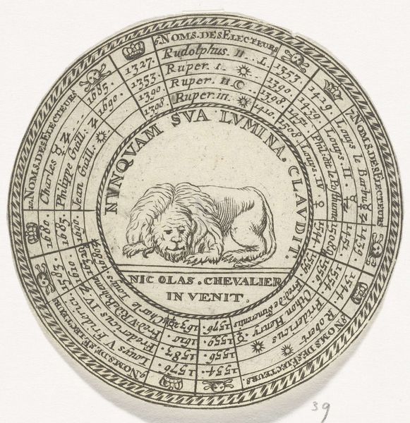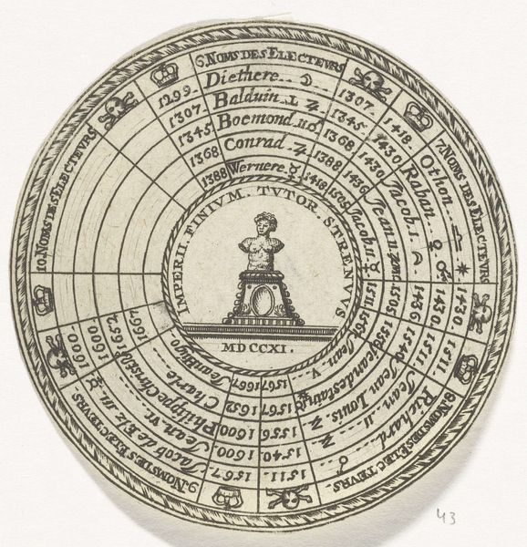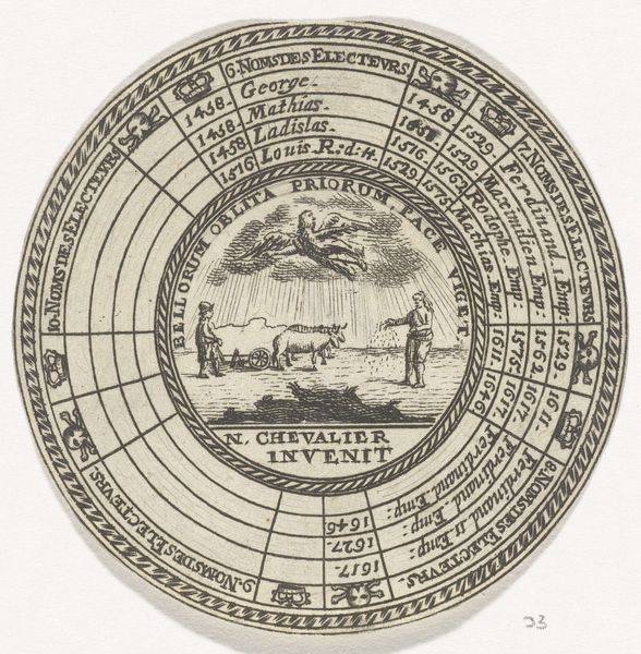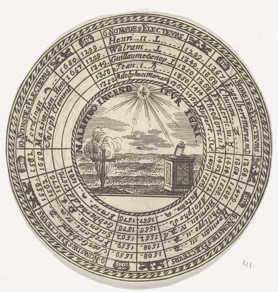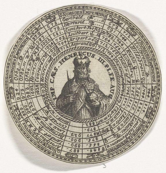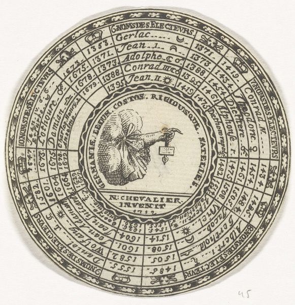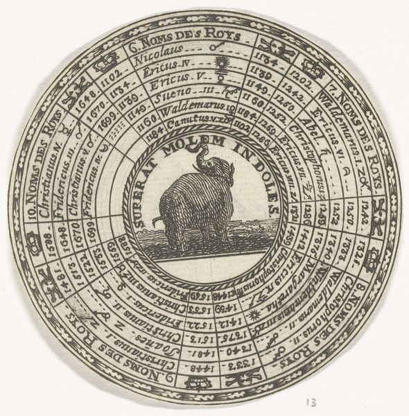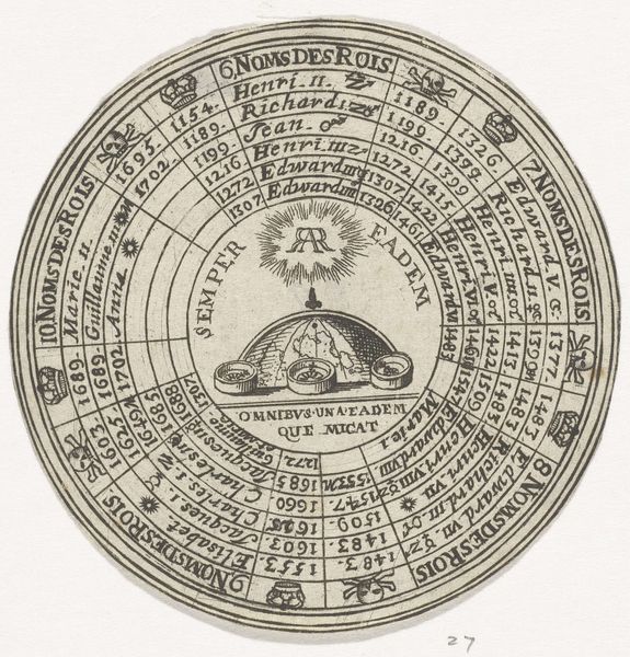 This circular print, listing the names of English kings, was made anonymously, most likely in the Netherlands. The process of printmaking—probably engraving—is central to its meaning. Lines are incised into a metal plate, which is then inked and pressed onto paper. The resulting image is characterized by sharp, precise lines and the possibility of mass production. The visual style is closely related to calligraphy and ornamental script, which are both highly skilled traditions. But the mode of production is tied to wider issues of labor and consumption. Consider the amount of work involved in creating this intricate design, not just by the engraver, but also in the extraction and processing of the metal used for the printing plate. These are precisely the kinds of considerations that encourage us to look beyond traditional distinctions between art, craft, and design, and to see them all as part of a larger social and economic picture.