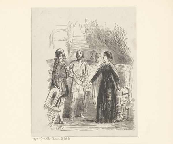 Editor: So, this is "Two Men Threatening a Woman" by Willem Frederik Wehmeyer, sometime between 1842 and 1873. It's an engraving, so the detail is really striking. I'm immediately drawn to the drama – there’s such tension in their body language. What do you make of this scene? Curator: Indeed. It's fascinating how a seemingly simple genre scene can hold such charged symbolism. Notice the gaze of the central man, unwavering, direct. The accusatory gesture, too. What cultural memories do these figures evoke for you? Does it speak to gendered power dynamics? Editor: Definitely. It feels like a power play, she is looking away to the left with more light exposing her body language than those of the two men on the opposite side. Is that perhaps indicative of more going on under the surface? Curator: Precisely! Consider the domestic space, typically considered the woman's domain. How is that subverted by the intrusion of the two men? What does it say about the presumed safety of women during the Victorian period? Is her resistance successful in holding on to this place of presumed sanctuary? Editor: I hadn't considered that subversion of space so explicitly. The title says Threatening, but where did the narrative for this image derive? It could also be indicative of more common struggles during that period as well... Curator: Exactly. By delving into its symbols and archetypes we glimpse the psychology of an era – anxieties, social structures, and underlying cultural tensions. Visual symbols like posture, facial expressions, location… they accumulate meaning over time. Is it only gender at play here or are wealth, or possibly colonial dynamics hinted as well? Editor: I now view narrative images very differently! Thinking about cultural memories really layers meaning into even the simplest of compositions. Curator: Yes, indeed. We discover it isn't merely a scene but a condensation of complex ideas carried through imagery.