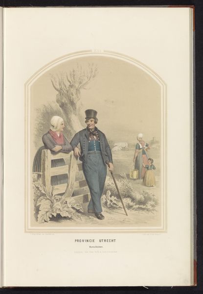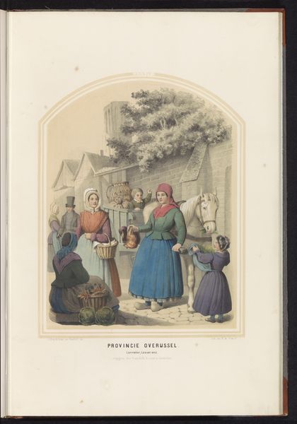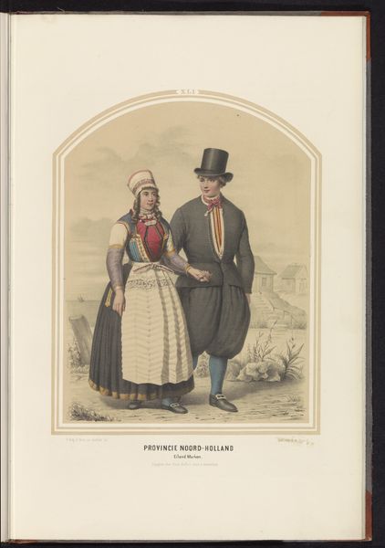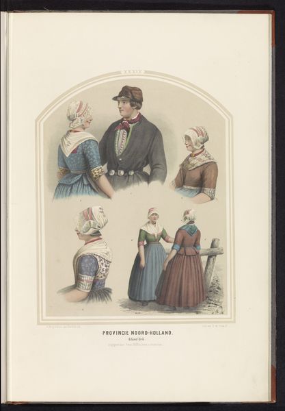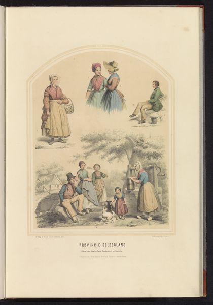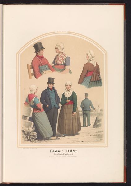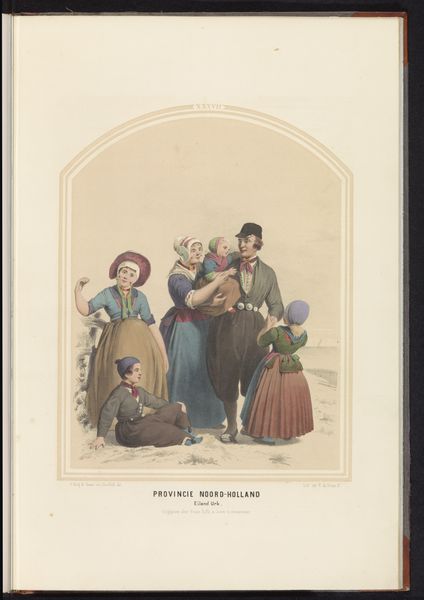 Curator: Here we have a watercolor print from 1857 entitled "Klederdracht van eiland Marken in Noord-Holland," or "Traditional costume from the island of Marken in North Holland." It's a lovely genre scene. Editor: Immediately, I'm struck by the composition; it’s as though each figure occupies its own distinct plane within the arched frame. It lends a certain stateliness, wouldn’t you say? Curator: Absolutely. Ruurt de Vries, the artist, seems to have really captured that romantic era's fascination with capturing culture, in a similar way to daguerreotypes, just less instantaneous. It feels... almost wistful. The scene depicts residents of Marken island skating in their traditional garments, but something about their arrangement also speaks to a stillness, a tableau of their way of life. Editor: Precisely. There's an interplay between static representation and active motion, seen clearly through that balance, particularly in the man with the tall hat in contrast to the bending children who give the idea of skating a subtle gesture that draws you in.. It is visually delightful, however, from the puffed pants on the males and the round hats of the females. They all seem rather bundled up. Curator: Well, Marken, you know, was isolated. It's an island in the Zuiderzee; imagine a landscape defined by water, harsh weather. These clothes? Not just for show. They’re functional. You know, the watercolor technique here really adds to the atmosphere. It brings out the cold tones and highlights the softness of the textures of cloth. Editor: The cool washes contribute significantly to the atmospheric conditions; a semiotic of clothing as geography, as it is an environment to be braved in and of itself. But in those washes are strong lines and forms which serve the painting very well. It gives it weight. Curator: I completely agree; it is wonderful how something so soft can be structured at the same time, if that makes any sense at all. Thanks for exploring it with me today. Editor: An utter pleasure, thank you.