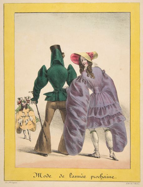 Editor: So, here we have “Chinois de parisiens!” from 1832, a lithograph print by Numa, held at the Minneapolis Institute of Art. It's definitely a striking image, almost comical. The figures’ exaggerated costumes make them appear a bit like caricatures, which, given the title, I imagine is the artist’s intent. How do you interpret the visual symbolism in this print? Curator: The title itself, “Chinois de parisiens!”, already sparks an interesting interplay. The term "chinoiserie" became popular throughout Europe in the 17th-18th century referencing asian artistic influence on the West. But it also spoke to cultural stereotypes that may have persisted into the 19th century. Why do you think the artist chose that title? Editor: Perhaps he was poking fun at Parisian society, implying that their fascination with fashion made them appear foreign or absurd. Or perhaps they mimicked an aesthetic from the far East? Curator: Exactly! Consider the era—Romanticism, yet the sharp lines suggest social critique too. These exaggerated silhouettes became symbolic of the "Incroyables," almost an anti-fashion statement of the time, mocking the aristocratic styles after the Revolution. Notice how each figure distinctively wears exaggerated accessories to make bold statements. This image thus becomes a visual record of not only style but shifting identities. What do these "Incredible" caricatures tell us? Editor: It gives us a window into the changing societal norms, or at least a commentary on them. It shows how clothing, even in its absurdity, can reflect identity. I didn’t even pick up on those layers initially. Curator: And that's the beauty of art—it's a visual echo chamber of history, culture, and the ever-changing self. I will definitely be contemplating the influence of popular stereotypes when considering historical artworks from now on!