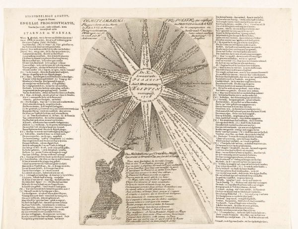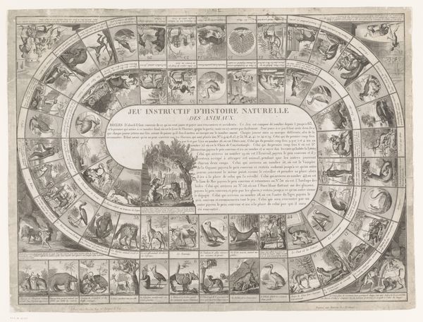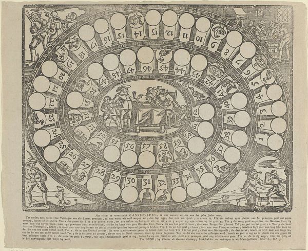 Editor: Here we have "Ganzenbord der Constitutie Unigenitus van paus Clemens XI," dating back to around 1723-1724, created by an anonymous artist. It’s an engraving printed on paper, housed at the Rijksmuseum. It’s overwhelmingly textual at first glance, almost like an elaborate game board. What do you see in this piece? Curator: What strikes me is the level of textual information embedded within the visual framework. Look at the paper itself: the raw material, and the conscious labor behind producing and distributing such printed material. It reflects not just artistry, but the mechanics of social discourse during that period. The physical labor involved, from papermaking to printing, highlights a certain social dynamic that is often overlooked in art history, wouldn’t you agree? Editor: That’s interesting. It’s easy to forget the sheer labor involved in pre-industrial printing. What purpose might these "mechanics of social discourse" have served? Curator: Well, examining the process reveals that these aren't just aesthetic decisions, but rather strategic maneuvers intended to circulate certain viewpoints within a very specific audience. Who was consuming this, and under what material conditions were they doing so? The piece can only have functioned within specific conditions of accessibility. Can we assume, given its complexity and use of language, that the working classes would have had the means or, frankly, the inclination to access the discourse being conducted through such an object? Editor: So, it’s not simply about the artistic skill involved in the engraving, but also about how the materials and their accessibility shape who gets to participate in the conversation. Curator: Precisely! By considering the means of production and distribution, we gain a clearer picture of the social forces at play and challenge the idea of a singular, objective art-historical narrative. It encourages a conversation around materiality. It pushes us to acknowledge that artworks, especially prints like this, are more than aesthetic objects: they are material products embedded in complex systems of production and consumption, isn't it fascinating? Editor: Absolutely. Thinking about it that way really opens up a whole new perspective! Thanks.