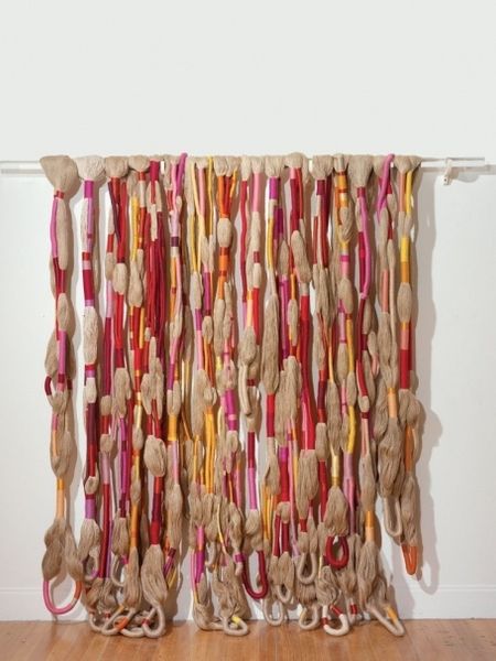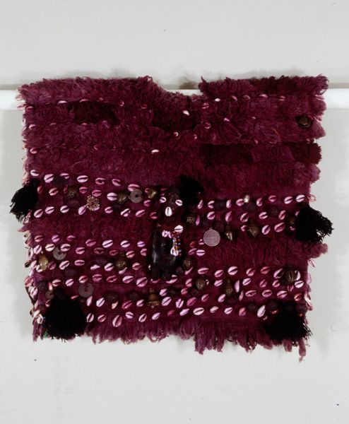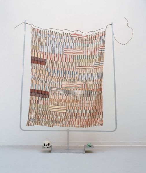 Curator: Jannis Kounellis created this *Untitled* piece in 1968. It presents a fascinating intersection of organic materials and structured form. Editor: Right away, I'm struck by its delicate yet almost unsettling presence. Like laundry hung out to dry in some spectral home. The blues and grays feel so faded, almost haunted. Curator: Indeed. Note how the artist contrasts the raw texture of what appears to be wool or fiber with the rigid geometry of the wooden frame. It's a deliberate tension between the natural and the constructed. Editor: It also makes me think about layers...memories, maybe? Each strand overlapping and slightly obscuring the others. The sense of history hangs heavy in there somewhere, like old secrets in the attic. I can almost smell dust and mothballs. Curator: The repetition of form—those horizontal bands of fiber— establishes a visual rhythm. There's a musicality to the composition. Think of serialism in music—variations on a theme. Editor: That's true. But for me, there's also an imperfection to that repetition that adds to its human quality. The fibers are not perfectly aligned; they sag and droop in their own way, as if fighting against being conformed, a silent form of protest maybe? It gives it life. Curator: Considering Kounellis' Arte Povera affiliation, one could interpret the work as a commentary on consumerism and industrialization, repurposing mundane materials into a refined aesthetic object. Editor: Yes, a transfiguration of the commonplace! I love that. A challenge to the way we look at and value our surroundings. It whispers, "Even in decay, there is beauty. Even in the discarded, there is worth." Almost biblical! Curator: Kounellis forces us to reconsider the object and, in doing so, prompts an awareness of the space it inhabits. Editor: Makes you want to touch it, doesn't it? But then you pause and consider how something seemingly fragile can contain such robust implications. Very clever. Curator: Absolutely. This piece, through its contrasting elements, opens a space for ongoing inquiry. Editor: Exactly. After a few minutes, I feel invited into a whole world beyond its simple arrangement.