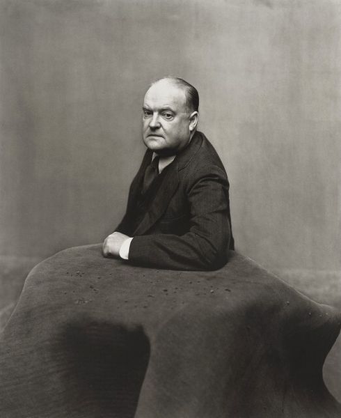 Editor: Here we have Rosalind Solomon’s gelatin silver print, "Gene Davis, Washington, D.C.," possibly from 1978-1980. It's a striking portrait, intense and introspective. What visual echoes or meanings jump out at you? Curator: This portrait certainly possesses a contemplative mood. I notice the hand supporting his chin, a classical gesture that implies deep thought or perhaps even a weariness. How does this echo the larger artistic themes present in Davis’ work? Editor: That's a great question. He was a color field painter, and there isn't a lot of explicit symbolism that I know of. Curator: Consider the symbolic weight of baldness itself in various cultures throughout history – a signifier of intellect, defiance, or vulnerability. Do you notice it creating a dialogue with the sharp, almost architectural lines formed by his eyebrow? Editor: Yes, it emphasizes the gaze. But are we maybe projecting meaning where there isn't any? Isn't this just a straightforward portrait? Curator: A portrait is never *just* a portrait. The artist chooses a pose, a setting, to convey something. This black and white image creates stark contrast, further highlighting those architectural lines. Does that severe contrast perhaps relate to the precision and deliberateness of color field painting? Editor: I didn’t consider that parallel before, but it's fascinating to consider the portrait as mirroring Gene Davis' broader artistic identity through these formal qualities. Curator: Indeed, visual languages are rarely simple—they layer, intersect, and sometimes even contradict each other to create a lasting impression on cultural memory. Editor: This has completely changed how I'll view portraits from now on! Thanks!
