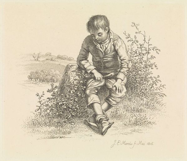 This pen and ink drawing by Lorenz Frølich captures a poignant scene. Titled "Little Boy on His Way to School, Little Girl in a Door," the artwork presents a tableau of childhood simplicity and the structured beginnings of formal education. The composition is structured by the juxtaposition of the boy in motion and the girl at the doorway, framed by the architecture of a modest dwelling. The artist’s delicate hatching creates textures that define the forms and add depth to the scene, while also reflecting on the cultural and philosophical concepts of domesticity and emerging social roles. Frølich's piece engages with the semiotic significance of clothing and setting, suggesting the social coding inherent in everyday life. The materiality of pen and ink itself underscores the themes of transition and recording, capturing a transient moment. The artwork challenges fixed notions of childhood innocence by imbuing the scene with subtle signs of social structure, inviting ongoing interpretation.
