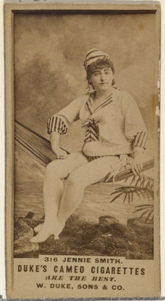This is a promotional card of Ivy Willis, an actress, made by W. Duke, Sons & Co. to advertise Cross Cut Cigarettes. In the image, Ms. Willis is seated, wearing a striped bathing suit, with palm trees and a shore behind her. The striped garment in the image speaks to a long history of nautical symbolism, a motif that recurs across cultures. Think of the association of stripes with sailors' uniforms; originating perhaps in 1858 by the French Navy to distinguish seamen and make them more visible if they fell overboard, the motif echoes earlier protective devices. Similarly, the palm tree, often associated with exotic locales and leisure, also carries connotations of paradise and triumph, recalling classical antiquity where it symbolized victory and eternal life. These symbols tap into a collective yearning for escape, adventure, and the exotic. The artist utilizes this iconography to evoke a sense of allure and aspiration. In doing so, it reflects and reinforces deeply ingrained desires and fantasies within the collective psyche.