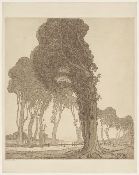 Editor: So, this etching is by Wijnand Otto Jan Nieuwenkamp, possibly created between 1902 and 1910. It’s titled "Waringinbomen in de tuin van het paleis van de sultan in Jogyakarta." The overwhelming tree, almost like an arch, gives the piece a sort of grand, solemn air, wouldn't you agree? What aspects of this work strike you the most? Curator: What immediately captures my attention is the subject itself: the Waringin tree, or banyan, and its location within the Sultan’s palace gardens. Waringin trees hold deep symbolic value in Javanese culture, representing protection, wisdom, and the connection between the earthly and spiritual realms. Think about the socio-political implications: Nieuwenkamp, a Dutchman, depicts a deeply Javanese symbol situated within the seat of Javanese power. Do you consider this a respectful observation or a representation laden with colonial overtones? Editor: That’s a complex question! The technique, this very detailed etching, seems to treat the subject with reverence. The scale emphasizes the grandeur... but you are right, a European artist choosing to represent a local symbol raises many issues about cultural ownership and representation. Curator: Exactly. The piece operates on several layers. The very act of depicting the tree as a central, almost monolithic figure elevates it but also possibly exoticizes it for a Western audience. The meticulous detail in the etching speaks to the influence of Dutch Golden Age landscape traditions. Are we looking at a genuine interest in Javanese culture, or is it filtered through a colonial lens? Editor: I suppose it could be both. I never would have thought of the banyan tree as symbolic without you explaining the socio-political context. Curator: It illustrates how art is inseparable from its historical and cultural moment. By understanding the context, the artwork reveals not just what is depicted, but who is depicting it and why. Editor: This perspective really opens my eyes. I now see how crucial it is to look beyond the aesthetics and consider the power dynamics at play.