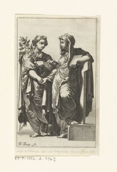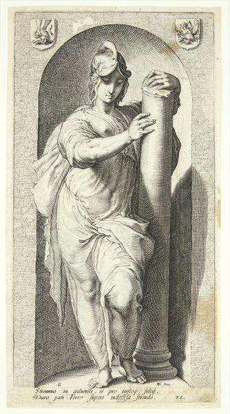 Editor: So, here we have Giovanni Volpato's engraving, "The Delphic Sibyl after the fresco by Michelangelo in the Sistine Chapel," created between 1784 and 1790. It strikes me as a study in contrasts: the sibyl's serene face against the implied drama of prophecy, and the cool tones of the engraving against what must have been vibrant colors in Michelangelo's original fresco. What do you make of it? Curator: It's interesting that you mention the contrast because it encapsulates a lot of what was happening at that time. This is a Neoclassical piece interpreting a Renaissance artwork, right as the Grand Tour was becoming popular. This print allowed for mass consumption of what had only been available to elites, in Rome. It democratized art. Now, knowing that it served as a souvenir, how does this influence the status of Michelangelo's frescos? Editor: That's a fantastic point! Turning something sacred, a religious scene, into a popular souvenir seems almost...blasphemous? Were there debates about that at the time? Curator: Absolutely. There were discussions around authenticity, originality versus reproduction, and access to art. Prints like this one by Volpato fueled those debates. They raised questions about who gets to define "high" art, and what purpose should art serve – religious, political, decorative, or something else entirely. Looking closer at the sibyl's positioning alongside young scholars or artists in the background, how can we interpret what her gaze means to them? Editor: Hmm, perhaps they see her wisdom as an inspiration? Or perhaps they are reinterpreting that knowledge for a modern world? It feels like Volpato’s engraving becomes a new object of interpretation. Curator: Exactly! Volpato wasn't just replicating Michelangelo. He was participating in an ongoing conversation about art, culture, and the role of the past in shaping the present. It gives us great insight into that time. Editor: That makes me appreciate it much more. Thanks! Curator: You're welcome! Considering historical context can add exciting layers to something we may think we already know.