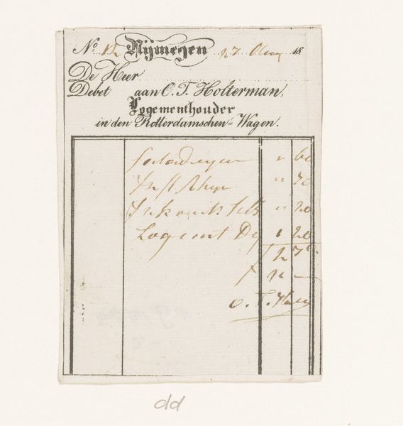 Curator: Well, hello there. Isn't this delightful? It looks like an old engraving, but it’s actually an invoice! I love finding art in unexpected places, like here, in a flower shop bill. It's so charming! Editor: An invoice from 1842? From Constantin Magasin de Fleurs fines in Paris, no less. It gives you a peek into the daily life, the commerce, of a very different time. It looks delicate, formal… almost like a poem written in numbers. Curator: Exactly! Each beautifully flourished number representing the cost of petit Légirons et herb or a corsage! It makes you wonder about the customer. "Madam la Comtesse de Arzgout Dort." Someone important and with exceptional taste to buy the best flowers in Paris. What occasions required such gorgeous blooms then? I feel an emotion of beauty and luxury! Editor: It shows you what aspects of life were being formally documented. The attention to the shop's letterhead—an engraved crest practically shouting its brand—shows the rise of commercial culture in 19th century Paris, an attempt to create this idea of trust and prestige with customers. Flowers, an ephemeral pleasure, become part of this world. Curator: You make a fantastic point. Did such details truly assure clients? What did luxury mean then, or value itself for that matter? Did the ephemeral beauty even matter among strict, monetary terms of paper? So intriguing to ponder. Editor: And the invoice becomes an unintentional piece of art, doesn’t it? What survives isn't the flowers that delighted the Comtesse, but the piece of paper detailing her purchase. It tells an important history about what got saved, kept, and by whom. Curator: What a lovely memento it is for us. A time capsule, a tiny story blooming out of the past, just for us to enjoy and learn from! Editor: A document transforming over time, from the mundane to an unexpected symbol of beauty and history. Quite interesting.