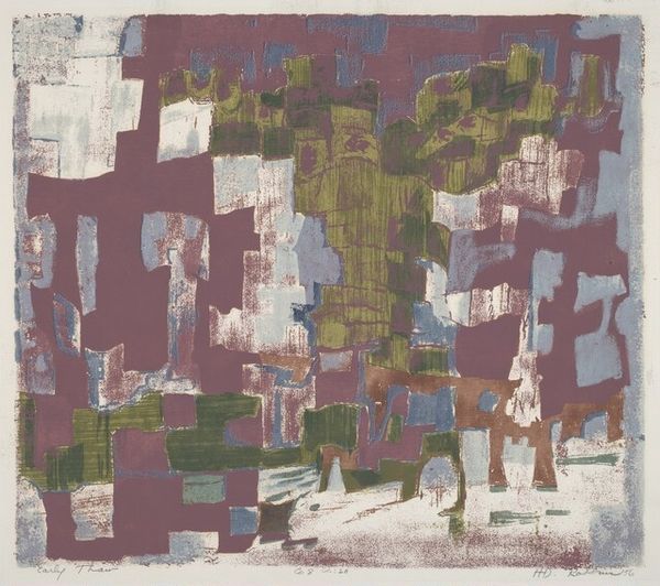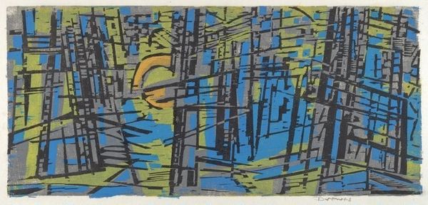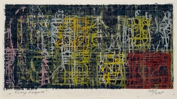 Editor: So this is Riva Helfond's "Night Shift" from 1940, a mixed-media print. It's this kind of puzzling cityscape in muted colors. The geometry feels restless to me, but I’m curious: What do you see in this piece? Curator: The symbols in "Night Shift" evoke the silent watchfulness that cities hold when most sleep. Notice how Helfond uses the grid—it’s not just structure, but a web. Consider the psychological weight of a city holding secrets, anxieties, dreams in its darkened architecture. Editor: A web, that's interesting. How does that web play into the title, "Night Shift"? Curator: The title tells us to think of who might be active in this silent cityscape—the marginalized, the laborers, those keeping the city alive. What emotions do these colors suggest to you? Editor: A kind of subdued unease, I think, perhaps related to the social anxieties of the time it was made? Curator: Precisely. This print uses abstracted geometric forms of buildings not to celebrate progress but to capture a cultural moment. The symbolic importance isn't only in what’s shown, but in what is not, suggesting hidden stories within the city's core. Editor: I hadn’t considered it as a story or record… Curator: Indeed. Each muted hue, each sharp angle carries cultural memory, almost like coded messages etched into the urban landscape. Now when you view it, do you see layers? Editor: Definitely, it feels less abstract and more like a narrative about the city at night, thanks to you pointing out the cultural and psychological dimensions.