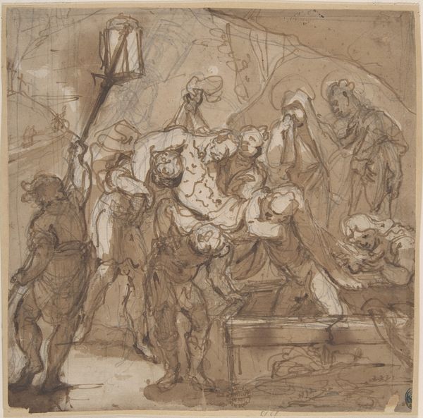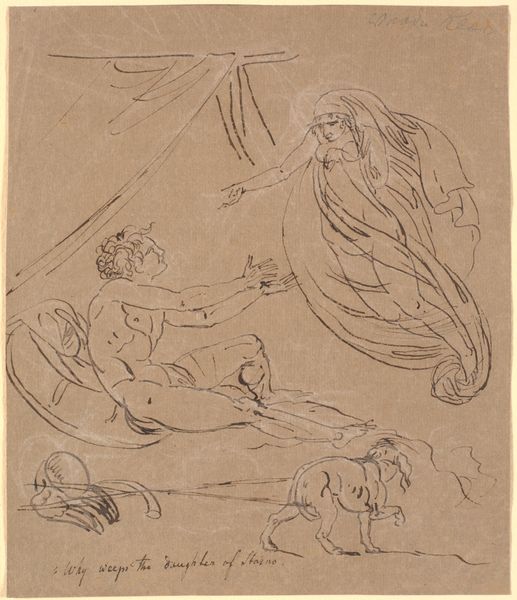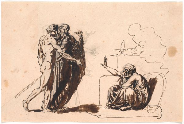 Editor: Here we have Nicolai Abildgaard's ink drawing on paper, "Theseus bønfaldes af Ismene og Antigone. Efter Sophokles," created between 1798 and 1801. It’s incredibly dramatic, the figures rendered with such stark lines, almost like a stage play. What stands out to you in this piece? Curator: What immediately strikes me is the theatricality, as you pointed out. Abildgaard, deeply embedded in Neoclassicism, deliberately chose scenes like this from Sophocles. But why? He was invested in the public role of art. What stories did classical antiquity offer that resonated with the political climate of his time? Editor: I see the Neoclassical style, that clear, almost austere rendering. Maybe these stories offered a framework for thinking about justice, civic duty, at a time when Europe was grappling with revolution? Curator: Precisely. Look at the composition – Theseus is positioned almost as a judge, surrounded by wise figures. Ismene and Antigone are in supplication. This is not just about telling a story; it's about presenting a model of leadership, invoking the authority of the past to comment on contemporary power. Consider how museums of this time also acted as custodians of these grand narratives. Editor: So, the act of depicting this scene is also a kind of argument? It advocates for a particular kind of leader and societal structure by referencing this story and style? Curator: Yes. It's about using art to participate in public discourse. Think about how these images circulate, get reproduced, influence taste… This wasn't just an artistic exercise; it was a political act. Editor: It’s fascinating to consider the painting as a form of political rhetoric within the museum space. Curator: Absolutely. And it prompts us to question how those power dynamics are at play today, too.