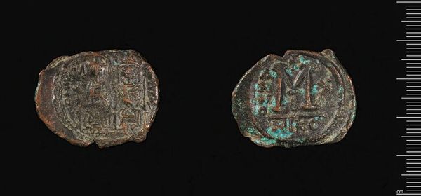 Curator: Before us is a coin minted under Justinian I, held in the Harvard Art Museums. Editor: It has such a tactile presence, despite being a digital image. The wear and the verdigris speak of age and history. Curator: Precisely. Notice the intricate relief of Justinian's profile on one side, with its stylized depiction of power and authority, balanced by the large "M," likely indicating the coin's value, on the reverse. Editor: The "M" dominates, doesn't it? Almost eclipsing the smaller symbols around it. It makes me wonder about the weight of commerce and its impact on the empire's cultural symbols. Curator: Indeed, a tension emerges between the emperor's image and the coin's monetary function. The composition suggests a negotiation between imperial ideology and economic realities. Editor: Considering the imagery, one can read it as a physical embodiment of the empire's power—both spiritual and economic. Curator: An insightful perspective, focusing on the interplay between form and historical context. Editor: It all leads to a more nuanced understanding of value and power. Fascinating.