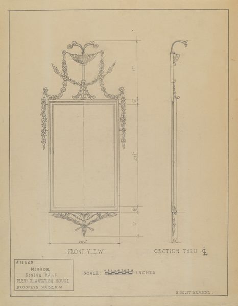 Editor: This is a drawing entitled "Chair," created by B. Holst-Grubbe between 1935 and 1942. It's rendered in pencil on what appears to be toned paper, depicting the front, side, and seat plans of an ornate chair. It looks like an architectural sketch. What can you tell me about the symbolism behind this type of drawing? Curator: This sketch presents a chair not just as a functional object, but as a vessel laden with cultural meaning. The intricate ornamentation, captured with precise detail, echoes the aspirations and values of its time, a longing for permanence and order perhaps. Holst-Grubbe, by meticulously detailing these designs, is participating in a dialogue with history, isn't she? How does that dialogue speak to you? Editor: I see what you mean, the detail is fascinating. So the ornate carvings, they're not just decorative. They carry the weight of tradition? Curator: Precisely! Each curve, each flourish becomes a visual echo of the past. We can almost hear the whispers of bygone eras embedded in the wood itself. And think about the act of drawing itself. Is it about preserving an object or immortalizing an idea? The act of sketching is a record and it speaks volumes. Editor: It's almost like the sketch itself becomes a kind of relic, capturing not just the form but the intention behind it. It is interesting how design acts like language through forms and patterns. Curator: Indeed! Through such symbolic renderings, we tap into a deep well of cultural memory, rediscovering shared connections across time. Perhaps these drawings show how symbols retain their emotional and psychological resonance. It truly shows us that material culture reflects cultural values and patterns. Editor: I never considered the emotional resonance an architectural sketch might carry. Now, I have a greater appreciation for these nuanced details. Curator: And that appreciation unlocks a richer understanding of ourselves.