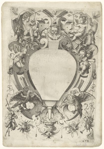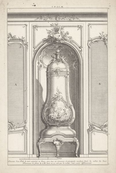 This ornamental design, made by Gilles Paul Cauvet in the late 1700s, is an engraving on paper, a medium that democratized art. The image is composed of a vertical arrangement of classical motifs, including cherubs, vases, and foliage. The engraving technique itself—precise lines incised into a metal plate, then inked and printed—allowed for the mass production of decorative designs, spreading Neoclassical style far and wide. Look closely, and you'll see the incredible detail achieved through the engraver’s skill. Each line contributes to the overall effect, from the smooth surfaces of the vases to the delicate rendering of the flora. This wasn't just art for art's sake; it was a pattern intended for use by other artisans, intended for the adornment of buildings. The print embodies a moment when art and industry were closely linked, with skilled labor playing a crucial role in shaping the visual environment.
