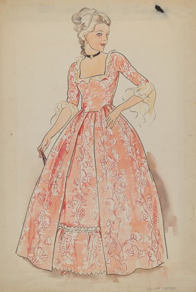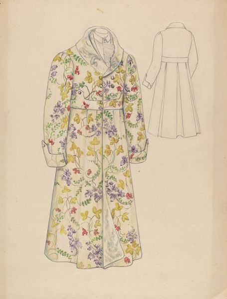 Dorothy Gernon designed this evening dress and cape using gouache and graphite on paper. The gouache sits on the surface, opaque, which is funny given the subject matter: the fantasy and illusion of dressmaking. The marks are small and tight, little commas of yellow that give the dress volume. Like a Seurat painting, but in reverse. Instead of lots of colours adding up to one, it's one tone made of many marks, which makes it feel kind of 'handmade', if you know what I mean? The pattern makes me think of the kind of fancy paper you get to line drawers or shelves. What I like most is the addition of the floating dress shape to the right of the main image, a ghost outline; a shadow; a thought bubble about the back of the dress? It's the kind of addition that makes the work, for me. And which links it to other artists, like Bonnard or Vuillard, who use pattern and colour to flatten space and disrupt form.