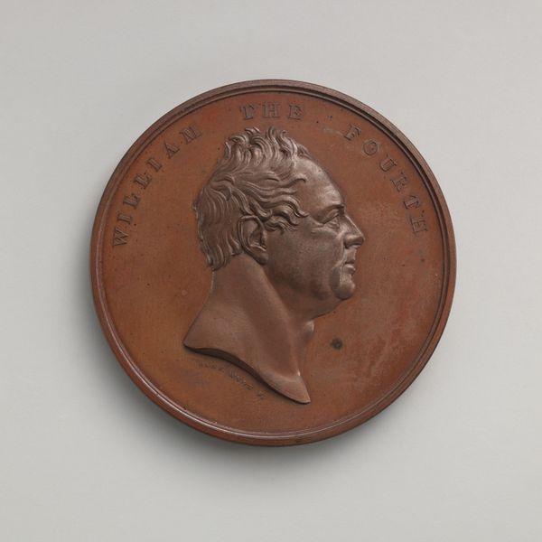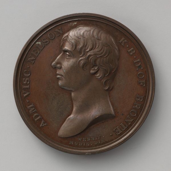 Curator: This bronze relief presents a profile of Henry William, Marquis of Anglesey, sculpted by Alexis Joseph Depaulis around 1815. It memorializes the man who led the charge of the British cavalry at Waterloo. Editor: Bronze… Immediately, I get this feeling of something old and strong. Like those museum doors, weighty with stories. There’s something dignified about this guy, but is that the metal doing the work? Curator: Well, bronze itself was definitely linked to power and status. Think of the massive effort, extracting copper and tin. This wasn’t mass-produced trinkets; it’s about underscoring Anglelsey’s importance. Neoclassicism in particular employed bronze to establish itself in classical precedent, associating itself with empire. Editor: Empire... right. That stern jawline certainly reinforces that. Almost a caricature, in its stiffness. Look at the lettering, though. It's carefully spaced but quite conventional. Curator: Depaulis mass-produced medallions. This specific medal design commemorates an important historical event – the Battle of Waterloo. Its value isn't as unique art object as much as artifact, reflecting the politics of production and the demand of historical momentos. Editor: You can’t deny though, the bronze adds depth. See how the light catches that prominent nose? It almost creates its own drama. It’s a moment captured in a material with permanence, practically demanding it be taken seriously. Curator: Right, it is an artifact invested with the semiotics of power: from the physical demands of the base components to the distribution of national heroes, these objects tell as much about who had it made than who it depicts. Editor: So while our Marquis stares stonily into the middle distance, his bronze skin speaks of empire, mass-production, and the human desire to hold onto important memories. Quite the multi-layered portrait!