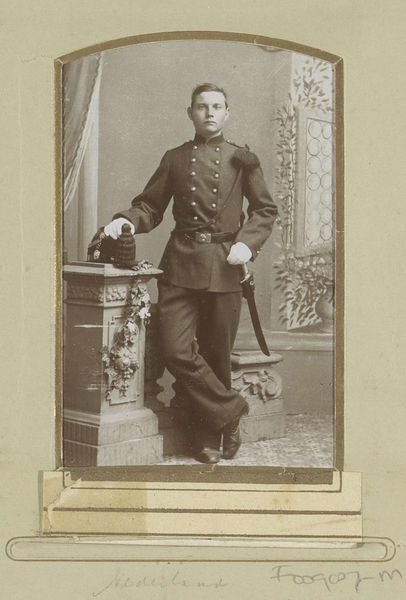 Editor: Here we have "Portret van een Indonesische man in Javaanse en westerse kleding," taken sometime between 1855 and 1885 by S. Ciantar Preziosi. It's a collotype photograph of a man in strikingly mixed attire. I'm initially struck by the subject's composed gaze and how his clothing seems to symbolize cultural intersection. What do you make of this, what does it suggest to you? Curator: Ah, yes! Doesn’t it feel like we're glimpsing a story unfolding? The blending of Javanese and Western dress… it’s almost as if the portrait whispers of shifting identities and colonial encounters. The collotype, that dreamy, soft focus… it gives the image a certain distance, like a memory viewed through sepia-toned glasses. I can't help but wonder: was this an attempt to bridge worlds, or a reluctant submission to cultural norms? What do you think the cane might symbolize? Editor: Hmm, that’s a fascinating point. I hadn't considered the cane as symbolic, maybe as just an elegant affectation, though your thought resonates. What about the setting – that ornate backdrop feels almost theatrical, contrasting with the subject's solemnity. Was that studio a common stage for such portraits back then? Curator: Exactly! These studios offered an escape – a chance to craft a persona. The opulent backdrop, rather ironic, doesn't it? It positions him in a world of Western elegance, all the while he's carrying his cultural identity in his clothing, juxtaposing these elements within the frame. You know, sometimes I see these old portraits as silent battlefields where identities clash and negotiate. Does that resonate with you at all? Editor: That definitely shifts my understanding of it. It's more than just a portrait, it is like visual historical record with tensions and choices embedded within it. The blending of attire feels like a nuanced negotiation, making me ponder the man's individual story and resistance strategies. Curator: I concur wholeheartedly! See? A conversation with art is often more insightful than a monologue, as new worlds reveal themselves to us. It goes beyond merely viewing an image; it's a dialogue through time!