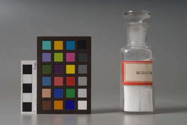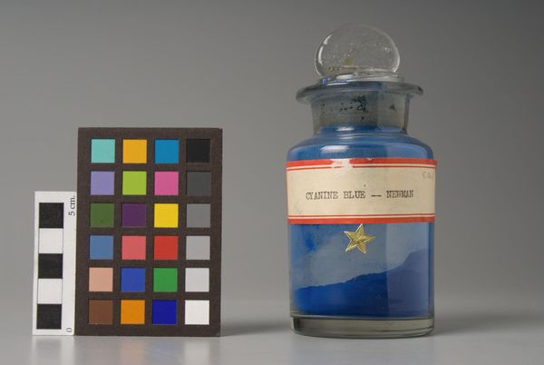 Curator: There's an almost alchemical feel to this image. The manufactured pigment, "Madder Orange," resides in a clear glass bottle with a handwritten label, alongside a color calibration chart. Editor: It gives me pause—the presentation of color in this way, so clinical, yet hinting at something deeply sensuous. The orange itself— historically, a symbol of passion and vitality. Curator: Indeed, madder dye, derived from the root of the madder plant, carries centuries of cultural weight, prized for its rich, stable hues. Imagine the labor and trade networks involved in its production. Editor: Exactly. This isn't just about visual experience. We're looking at an object that speaks volumes about resource extraction, industrial chemistry, and the global movement of materials. Curator: Yes, we are also looking at its power to transform something ordinary, such as clothing or paint, into something imbued with meaning and value, carrying history. Editor: Seeing it like this, it transforms my understanding of color from a surface effect to a product of human ingenuity and environmental transformation.
