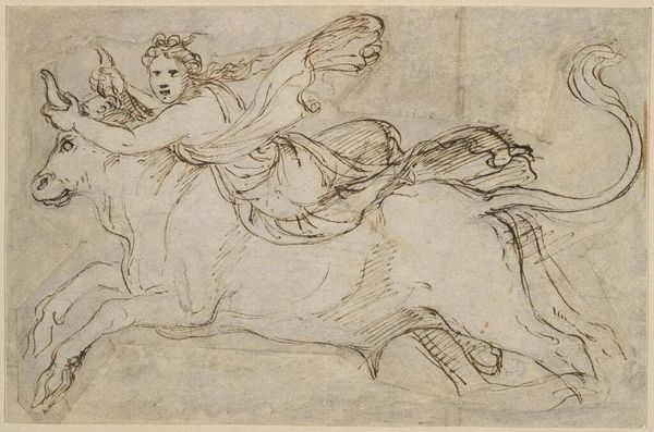 Editor: This drawing, "Europa and the Bull," dates from around 1600 to 1700. It’s by an anonymous artist and rendered in ink. There’s a lightness to the sketchiness that I find quite charming, and the reddish-brown ink gives it warmth. What can you tell me about this work? Curator: It's intriguing to consider this drawing from a materialist perspective. Note the use of ink. Who had access to ink and paper of this quality during the Baroque era? The accessibility of these materials tells us about the social standing of the artist or workshop responsible for its creation. Consider the labor involved: from preparing the ink, potentially from raw materials, to the physical act of drawing itself. Editor: So, you're saying the materials themselves suggest a certain privilege or at least access to specific resources. But wouldn’t mythological subjects like this one automatically denote the elite classes? Curator: Precisely. This isn’t merely a sketch; it’s a material record of a particular time, place, and class. Mythological scenes, favored by wealthy patrons, often involved preparatory sketches and studies within the workshops. This particular print likely circulated within an artist’s workshop. The level of refinement would denote the rank of the artist. Is the drawing more rudimentary, therefore for early planning, or refined with artistic flourishes to sell? Editor: I never really considered the material reality behind the artistic choices so deeply. It's more than just aesthetics, it reflects a whole system of production. Curator: Exactly. This approach breaks down the mystique surrounding the artwork, emphasizing its status as a crafted object, enmeshed within the socio-economic fabric of its time. Material is at the root of consumption and labour. Editor: Thank you, seeing it that way changes how I'll view art from now on.