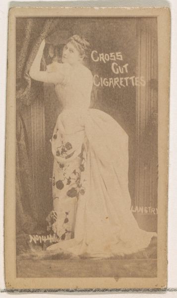This is a promotional card from around 1870 to 1920 made by W. Duke, Sons & Co. for Cross Cut Cigarettes. In it, actress Fanny Rice reclines in a gown, gazing into a triangular mirror. These cards, distributed with cigarette packs, offer a glimpse into the cultural values of the time. Rice, a celebrated performer, is carefully posed, embodying ideals of feminine beauty and grace. The advertisement reflects a society where the consumption of tobacco was being intertwined with aspirations of sophistication and celebrity culture. Consider how such images shaped perceptions of women and their roles. Actresses like Rice occupied a unique position, both admired and scrutinized by a public eager for entertainment and novelty. The card invites reflection on the dynamics of fame, consumerism, and the construction of identity in the late 19th century. It reminds us of the complex relationship between art, commerce, and the shaping of societal norms.