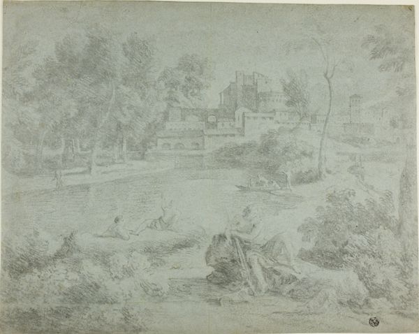 Curator: Giovanni Francesco Grimaldi, also known as Il Bolognese, created this drawing, "Figures Seated by a River," employing ink, graphite, and chalk on paper. It’s a baroque landscape drawing, and although undated, its style firmly places it within the 17th century. Editor: There’s a dreamlike quality to it. The sepia tones give it an aged feel, but the landscape itself seems almost timeless. It feels both intimate, with the figures in the foreground, and expansive, with the river winding back into the distance. Curator: The figures are central, aren't they? Notice their arrangement and the echoes of classical groupings within them. One grouping on the left feels almost maternal, while the figures on the right, arranged almost in profile, recall depictions of the Muses. Editor: It's fascinating how Grimaldi uses the landscape as a backdrop but imbues it with so much symbolic potential through these figures. It invites the question of who these people might be—and, importantly, *why* they're here by this river. Is this meant to evoke a sense of idyllic leisure, or is there a deeper narrative unfolding? Are the bodies coded with some historical, mythical, or religious import? Curator: Considering the historical context, the river itself acts as a powerful symbol, representing transition, passage, the flow of time… think of it within the historical framework. Waterways were lifelines and borders. Here, though, the mood feels more contemplative, and there is very little, if anything, coded by contemporary aesthetic approaches. Editor: Yet it’s the very timelessness you mention that makes it interesting! It asks to be mapped against our present-day understanding. Perhaps the arrangement evokes a longing for connection, something increasingly precious today, for example. Or, thinking about landscape itself— who had access, historically and geographically? I am most concerned with which stories or memories these conventional bucolic scapes actively conceal. Curator: I see that! Grimaldi provides us with a snapshot of an imagined classical idyll that, although removed, carries a visual echo, if only faint, across the centuries. I leave seeing it a bit differently now, and more aware of how these landscapes served the wealthy during this period, as the ideal refuge from which to view the world. Editor: Precisely! And recognizing that silence, we can consider what active work it takes to dismantle these dominant narratives.