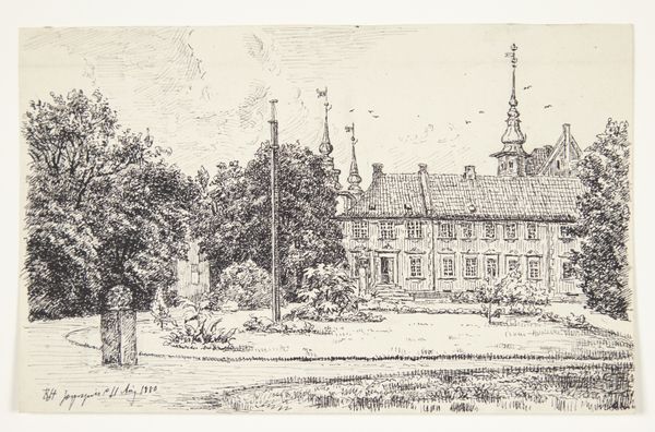 Curator: This watercolor drawing, "Stadhuis van Naarden," by Isaac Gosschalk, was completed between 1862 and 1867, showcasing the architecture in a Dutch cityscape. Editor: It strikes me as a scene captured in transient form, incomplete yet evocative. The muted palette and sketch-like quality grant a ghostly atmosphere, as though peering through time. Curator: The composition directs the eye along the strong verticals of the buildings, particularly that central structure with its prominent stepped gable—an archetype of Dutch Renaissance architecture. The contrasting levels of detail is fascinating; some areas are heavily rendered in watercolor, while others exist merely as ghostly pencil outlines. Editor: Note the symbols of civic pride embedded in the architecture; this town hall is rendered as more than a building, as a stage for social rituals. The bare tree seems to be watching the human comings and goings, too, giving the scene an additional layer of witness and memory. Curator: We can look more closely at how Gosschalk used layering. Notice how the facade of the most prominent building almost floats from its sketch-like surrounding elements due to its intense red against the flat, unmodulated sections of the image. This contrast brings architectural facade immediately forward. Editor: The incomplete rendering enhances its symbolic qualities, like a shared memory only partially recalled. The town hall, both present and suggested, gains further meaning; this location stands both in material and spiritual history. The architectural shapes signify strength but lack definite color. Curator: Certainly, that absence enhances a particular reading. Still, consider how Gosschalk plays with line and mass, generating interest through structured, rhythmic applications of color across architectural features. A network of shape and depth emerges, revealing itself upon closer consideration of the material composition. Editor: I suppose the symbols might not resonate without understanding this historical presence, that this Dutch town, still visible, provides continuity within that context and memory through image. Curator: A beautiful way of considering this artwork’s effect, reflecting how Gosschalk encourages us to decode meaning by examining constructed compositions. Editor: It seems like more than bricks, stones, colors. Instead, history, collective and personal, intertwines and reflects the story behind this captivating building.