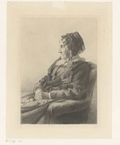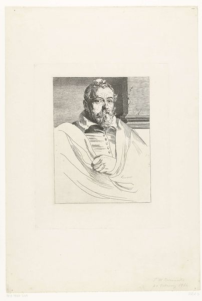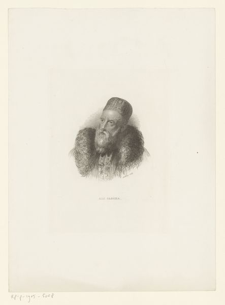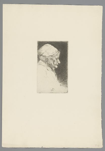 Curator: Looking at this etching, it’s hard not to be struck by its detail, despite its relatively small size. The way the lines capture the texture of the fur cap is remarkable. Editor: It evokes a feeling of solitude, even weariness, doesn't it? The closed eyes contribute to that mood, shutting the figure off from the world. Curator: Indeed. The artwork is titled "Bearded old man in a high fur cap, with eyes closed". It was created by Georg Leopold Hertel in 1761 and we're fortunate to have it here at the Rijksmuseum. The etching method allows for such fine lines and gradations of tone. Thinking about printmaking at this time, we have to remember it’s an essentially reproductive technology. Editor: A powerful way of disseminating imagery to a wide audience. What could an image like this, depicting perhaps a scholar or a philosopher, have signified in 18th-century society? Was this distributed amongst intellectuals, or did its reach extend further? Curator: It's also fascinating to consider the economic conditions of printmaking then, too. How much did the production of this image cost, and how would that shape who could afford to own or trade in prints such as this? We have to recall that while a printed image has that quality of reproducibility and repeatability, this is still an object. The quality of the paper itself is part of this work's own historical and material reality. Editor: The fact that the old man's eyes are closed intrigues me. Usually, portraiture seeks to capture the gaze, to connect the viewer with the subject. But here, Hertel deliberately denies us that connection. I wonder, is this a comment on the nature of perception, or perhaps mortality? Curator: That’s a poignant point to consider. The fur cap itself, luxurious, textural: the materials involved, their accessibility and expense, speak volumes. To consider, who would possess a fur cap of such height and expense, and what does that tell us of the politics and class structure of Hertel's day? Editor: Thinking about the broader context, the work exists at a fascinating point in art history, straddling the late Baroque and the burgeoning Neoclassical styles. We need to consider the rise of the merchant classes at the time. The artwork perhaps becomes not only a visual object but also a social artifact. Curator: Indeed. I’ve gained a deeper appreciation for the work by reflecting on both its material qualities and its potential historical interpretation. Editor: As have I. This glimpse into a past individual opens up larger questions about perception, labor, and class during a fascinating era of shifting social dynamics.
