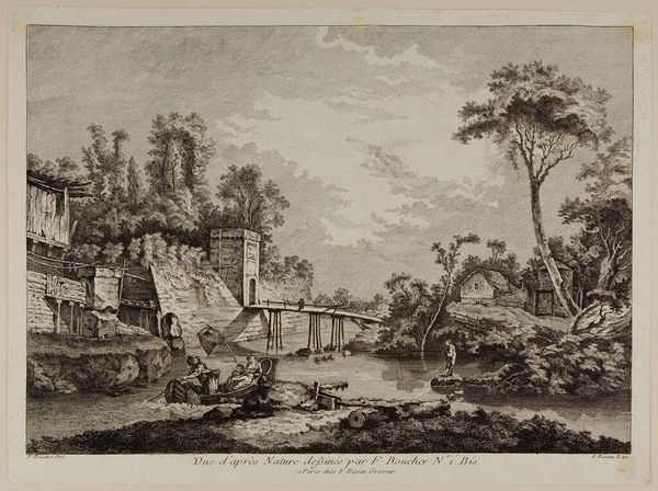 Curator: Here we have "Crossing the Brook" by James Davis, a landscape evoking a sense of tranquil pastoral life. Editor: Immediately, I'm drawn to the contrast between the dark, textured foreground and the ethereal distance—it creates an almost dreamlike state. Curator: The brook itself, a site of transition, carries symbolic weight. It represents a journey, a crossing into a new phase or understanding, especially given the figures wading through. Editor: Notice the interplay of light and shadow. The artist's use of linear marks and hatching creates a rich sense of volume and depth across the planes. Curator: And don't overlook the bridge in the background. Throughout history, bridges have often symbolized connections between worlds, hinting at the potential for spiritual enlightenment through nature. Editor: That distant bridge certainly punctuates the subtle diagonal structure of the composition. There is a visual rhythm created between the nearby trees, distant bridge, and flowing water. Curator: It is interesting to consider the continuity of such imagery. We see the human desire for harmony with nature repeated throughout artistic traditions. Editor: Indeed. By reducing a landscape to its essential forms, Davis shows us how lines can create the illusion of deep space and how light creates form. Curator: A seemingly simple scene, yet full of layered meaning—crossing the brook could be crossing into one's self. Editor: The interplay of form and light certainly gives life to that reading.