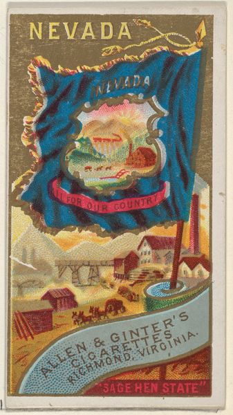 Curator: Welcome. We’re looking at “Korea, from Flags of All Nations, Series 1 (N9) for Allen & Ginter Cigarettes Brands,” a print and drawing created around 1887. You can find it here at the Metropolitan Museum of Art. Editor: My first impression is surprise. The romanticized seascape at the bottom, peeking beneath the crisp rendering of the Korean flag—it feels like a scene from a dream, where cartography meets poetry. Curator: Indeed. The composition employs a rather sharp juxtaposition. The flag is rendered with remarkable geometric precision—note the bars around the central Taegeuk symbol and its clear contrast to the almost impressionistic treatment of the ocean view beneath. The Ukiyo-e influences certainly soften its impact. Editor: Ukiyo-e is a key phrase here. It makes me think about the filters through which we perceive other cultures, even on something as seemingly objective as a national flag. Look at the color palette—golds, faded reds, blues against the austere white—how might Allen & Ginter use this print to make Korea legible, alluring to a Western audience? I am also intrigued that they used a Bamboo to hold up the flag, which may have been informed by a misunderstanding about what the poles are made from? Curator: The use of “orientalism” as a visual language cannot be dismissed, especially considering the intended audience. Cigarette cards were instruments for promotion. I am curious, what do you make of the framing devices in play here? Consider the gold bordering the top portion as a backdrop and the arc that the artist employs, giving us glimpses of a boat on water, and a clear indication of horizon. The symbolism— the vessel juxtaposed with the flag, speaks to the theme of ‘nation’ as much as commerce. Editor: Absolutely. And that’s where the dream comes back for me. National identity sold by a cigarette company, distilled into potent imagery, bending reality into something hazy and exotic. It tells us about the dreams of both nations and commerce, about projections of identity, power, and, well, maybe even smoke and mirrors. It feels deeply resonant with where the world stands today in the age of the internet, no? Curator: Yes, that interpretation, although speculative, is persuasive. Looking again, there's more complexity here than first meets the eye. It reflects the multilayered relationship between cultures during this time, which the Allen & Ginter series aptly illustrates. Editor: An old tobacco card opens the door to worlds, both real and imagined. Now, that's the magic of art, isn't it?