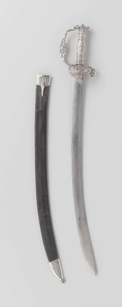 Curator: Here we have a saber made of metal; it's formally known as "Sabel lichte cavalerie model nr. 3, M.1814 met schede." Dating roughly from 1814 to 1866 and created by S. de Jager, this saber clearly held military purpose. Editor: Visually, it strikes me as an object of immense weight, both literally, given the material, and metaphorically. It's a tool built for imposing a very specific social and political order through force, if necessary. Curator: Precisely. The years in which it was made situate it in a period of immense societal upheaval after the Napoleonic wars, which deeply affected politics and culture on many fronts. We might consider the implications of military objects like this when thinking about nation building, and the role of institutional violence in constructing concepts like the "citizen." Editor: Absolutely, we can ask what sort of "citizen" does a tool like this both imagine and then require? It enforces a stark binary: us versus them, obedience versus resistance, worthy versus expendable. What are the cultural narratives circulating during the years this was made? What social anxieties or collective fantasies is it meant to alleviate? Curator: The choice of materials here also speak volumes. Its polished sheen reflects back not just light but, in its time, reflected a symbol of power, creating both awe and possibly, inspiring intimidation from both those who wielded it and who were forced to gaze upon it. Editor: Right, and what’s key to understand is the social dimension of that “power.” Power isn't abstract. The handle, the blade—each designed for specific forms of physical interaction within a framework of accepted violence. Curator: To think about the historical reception, we might explore military records, personal accounts, or visual culture of the period to gauge how such weaponry was perceived and its role in military strategies. Editor: From my perspective, it makes us think of the embodied nature of oppression. These objects are inseparable from systems of hierarchy, whether we talk about the design, the manufacture or intended use. Curator: Seeing objects like this pushes us to contemplate a nuanced vision of our world. It speaks volumes, even if now rendered inert. Editor: Indeed, thinking about the way the blade meets the hand allows us a unique point of reflection to engage and learn about those forces shaping human action in the theater of conflict.