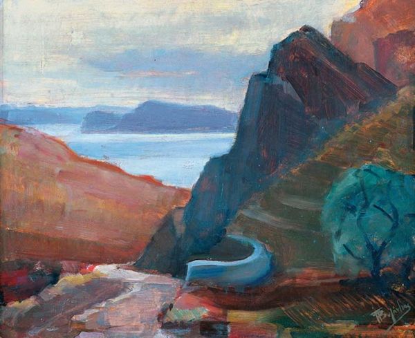 Editor: This is "Sunset in the Rockies" by Timur Akhriev, created using oil paints in a plein-air style. The colors are so vibrant, especially the yellows and oranges catching the light on those rock formations! I am curious, what's your interpretation of it? Curator: Let's look at this oil painting from a formalist perspective. Note how Akhriev divides the composition into distinct zones using color and texture. The rough, impasto strokes in the foreground give way to smoother, blended areas in the distant peaks. Does this strategic contrast enhance the feeling of depth, drawing you into the pictorial space? Editor: I think it really does give it that sense of depth. It's almost tactile, like I could reach out and touch the rocks! But, what does it all mean? Is there something else besides just the technique? Curator: The painting operates on a visual level primarily. Semiotically, the intense colors could be seen as signifiers of the sublime, or perhaps the untamed power of nature. Consider how the artist uses color to create a dynamic interplay of light and shadow, thus emphasizing the materiality of the oil paint itself, thick application becomes a focal point, don't you think? Editor: It's fascinating how focusing on just the colors, textures, and the artist's process can reveal so much. I typically think of Impressionism in terms of the personal impression of nature, but, in fact, this helps show us the meaning. Curator: Exactly, it's in these visual elements that meaning is constructed. Now I am wondering if you will reflect these features when considering your own artwork!