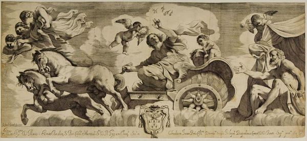 Giovanni Battista Pasqualini created this engraving, "Apollo en Aurora," in the early 17th century. It captures a vision of classical mythology, reflective of the era's fascination with antiquity. In this scene, Aurora, the Roman goddess of dawn, floats on clouds, scattering flowers, while Apollo, god of the sun, follows in his chariot, pulled by horses. The imagery is more than mere illustration; it's a statement on power, beauty, and the natural order. Consider how gender and power intertwine here; Aurora precedes Apollo, yet serves as a herald to his coming. Are we seeing a subversion or confirmation of traditional roles? The landscape below, rendered with meticulous detail, reminds us of the earthly realm touched by the divine. This piece invites us to reflect on our place within the grand scheme of the cosmos, to contemplate the intersection of myth, nature, and human existence. It is charged with the era's negotiations of faith, knowledge, and representation.