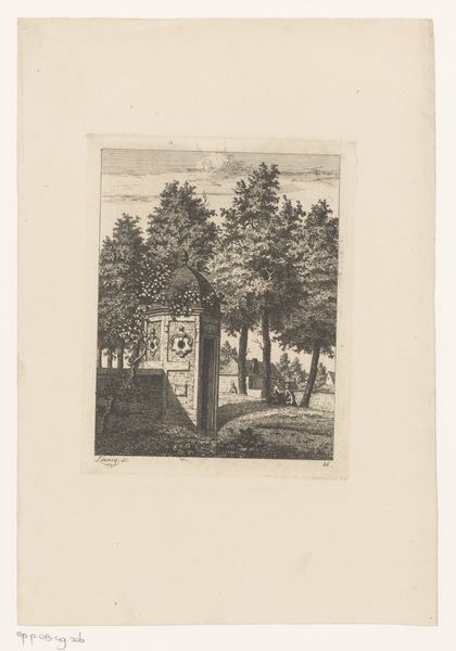 Editor: Here we have "Prieel in een landschap," or "Arbor in a Landscape," an etching by Laurent Verwey van Udenhout, likely created between 1894 and 1913. There's a distinctly medieval feel, and a rather somber tone. What catches your eye about this piece? Curator: It feels like a forgotten place, doesn't it? I’m instantly drawn to that arbor, how it stubbornly centers the frame, yet melts into its surroundings. The whole piece is like a whisper, urging you to look closer at the silent dialogue between structure and nature, between light and the deep, suggestive shadows. Do you feel invited into the scene, or kept at arm’s length? Editor: I feel…invited, but cautiously. The path is clear, yet the details are murky. Curator: Exactly! And that murkiness, that lack of easy definition, invites projection. Consider the trees, their skeletal branches. Van Udenhout isn't just representing trees; he’s evoking something primordial. Perhaps a subtle suggestion that humanity's grandest designs are destined to be reclaimed by the earth, softened and weathered, if we aren't mindful? The arbor's delicate steeple points hopefully upward, but is it reaching towards enlightenment or a beckoning nothingness? Editor: It's amazing how much complexity you've teased out of a relatively small etching. I was mostly struck by the atmosphere, but I hadn't considered those deeper contrasts. Curator: Art often wears multiple masks, doesn't it? And sometimes, the most profound revelations are whispered, not shouted. Discovering new dimensions is a delight. Editor: Definitely. It's helped me see past the surface to the story within. Thanks for that.